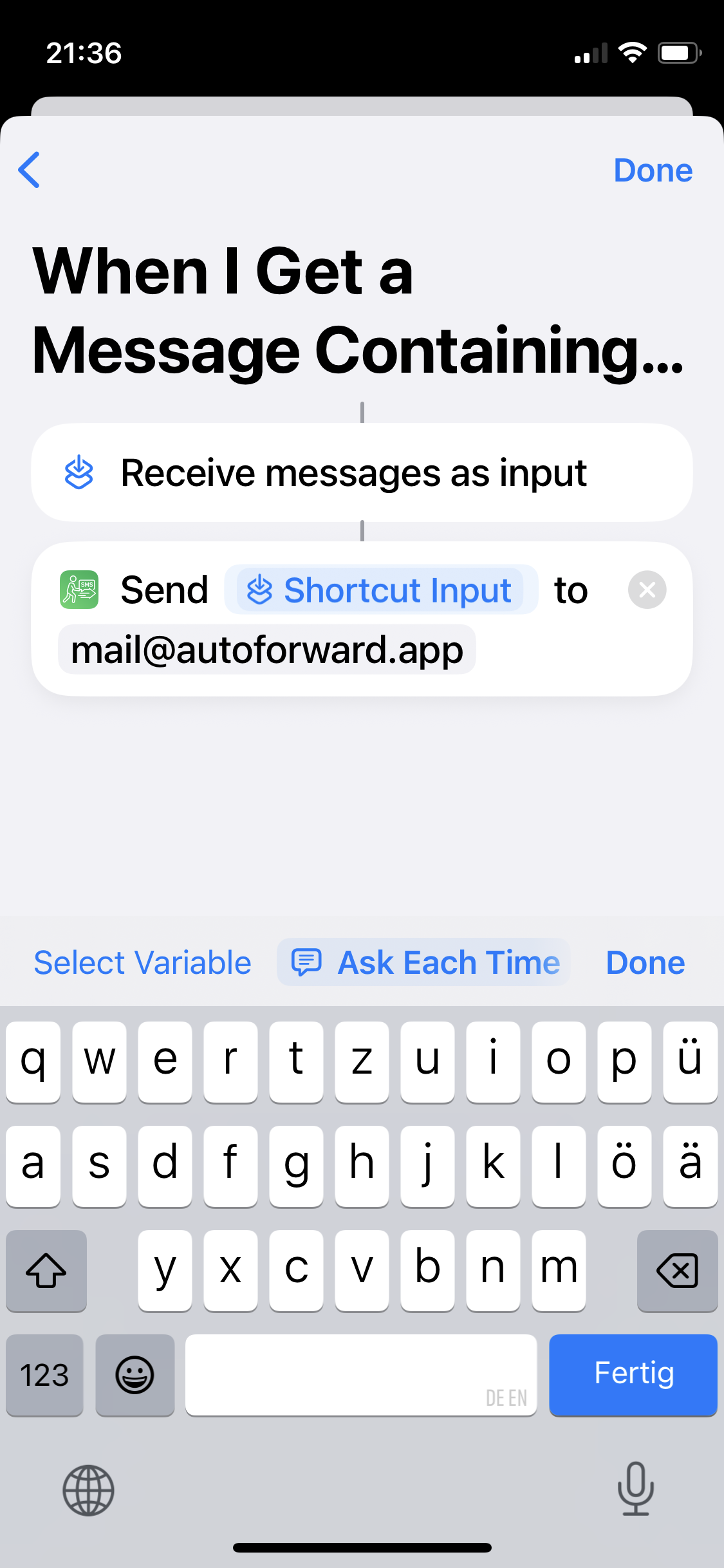 This guide will walk you through setting up SMS forwarding via email using the shortcut function of the autoforward app.
