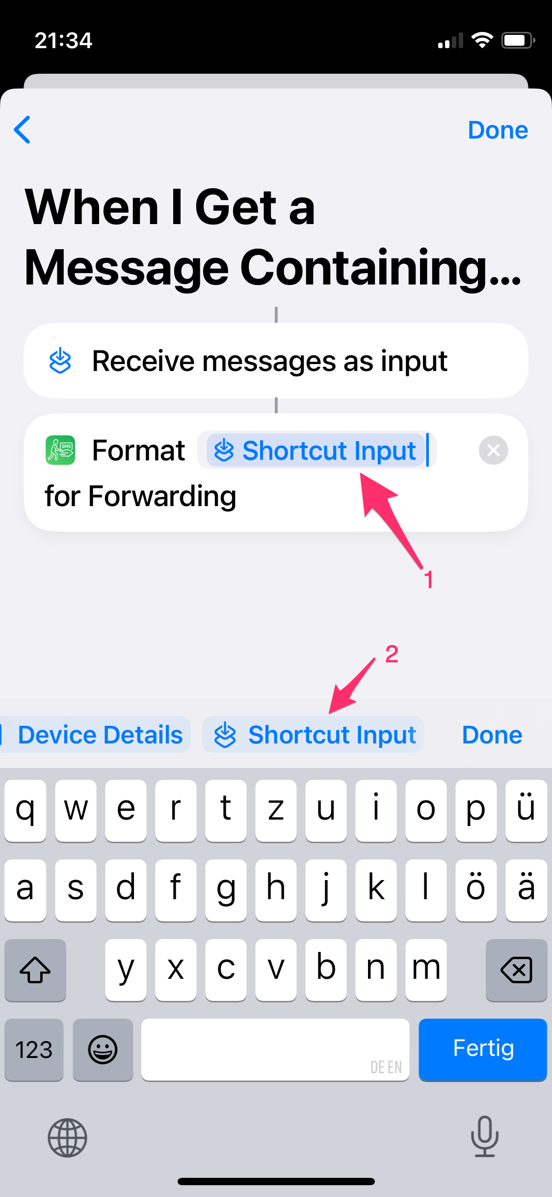 - Scroll to the right through the variables above the keyboard and select "Shortcut Input"